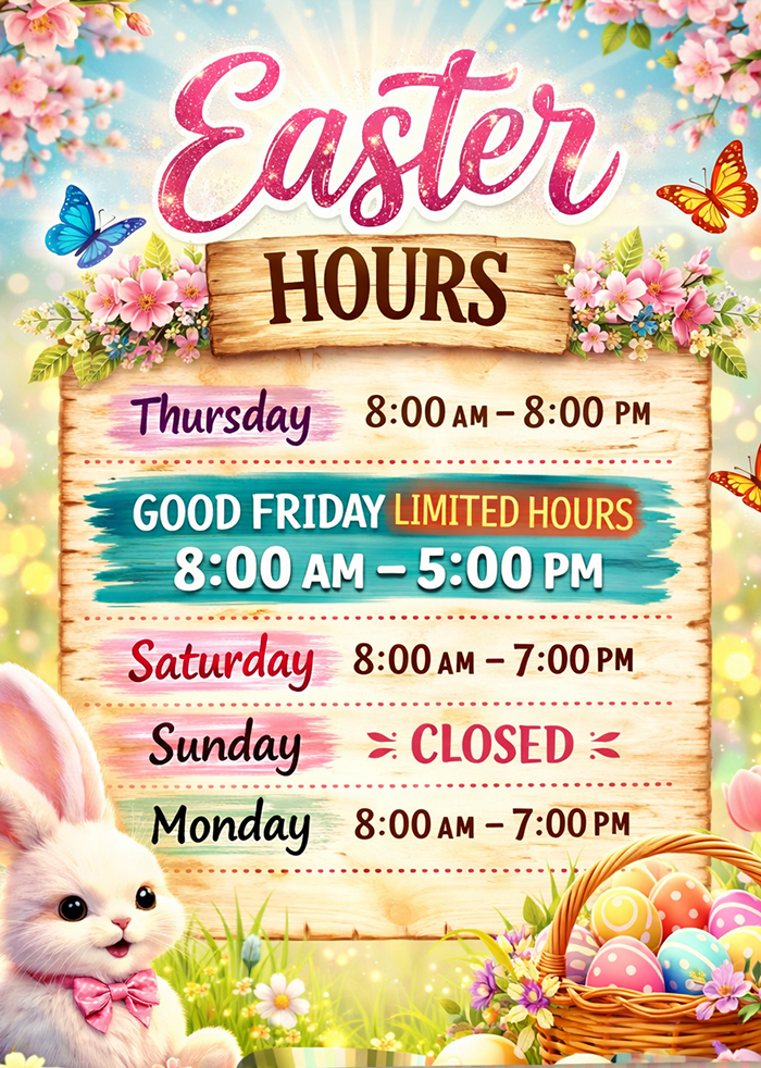 📅 Store Hours: Mon-Wed 8 AM – 7 PM, Thu-Fri 8 AM – 8 PM, Sat 8 AM – 7 PM, Sun 8 AM – 6 PM